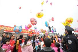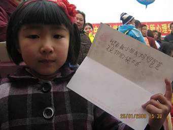 活动的第三个环节是给在现场的每一位小朋友发一张具有特殊意义的新年贺卡,在这个贺卡里有中央电视台著名节目主持人董浩叔叔、鞠萍姐姐和月亮姐姐的签名。小朋友拿到这张贺卡后,写上自己送给全国人民的祝福,由主办方提供的氢气球载着充满爱心的祝福卡飘散到周围地区,将这份意外的惊喜送给拾到这些爱心卡的人们。