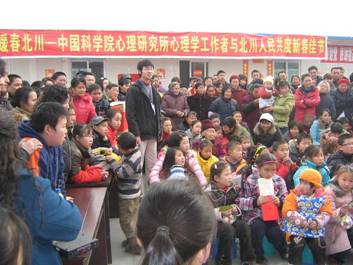 2009年的春节是汶川地震后的第一个春节,对于灾后的北川群众来说是一个非同寻常的节日。为了让灾区群众在特殊的时期度过一个祥和、温暖的春节,由中国科学院心理研究所危机干预中心(成都)、上海增爱基金会联合主办的饱含心理学元素的“暖春北川”行动拉开了序幕。