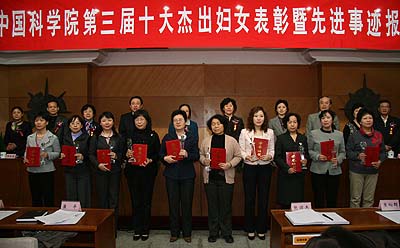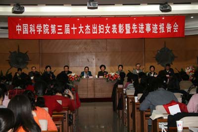 在“三八”国际劳动妇女节前夕,为表彰先进并激励广大女职工积极投身创新实践,中科院决定授予王娜等10名同志“中科院十大杰出妇女”称号,授予田世平等10名同志 “中科院十大杰出妇女”提名奖。3月3日,在北京举行了隆重的表彰大会暨先进事迹报告会。中科院“十大女杰”代表在会上作先进事迹报告。全国妇联、中央国家机关工委和中科院的有关领导出席会议并讲话。 中科院党组成员、副秘书长何岩首先宣读了全国人大常委会副委员长、中科院院长路甬祥发来的贺信。路甬祥在贺信中代表院党组向全院女科技工作者致以节日的问候和美好的祝愿!向荣获中科院十大杰出妇女称号的同志们致以崇高的敬意和热烈的祝贺!他指出,第三届十大女杰为中科院的改革创新发展做出了突出贡献,为全院女科技工作者,也为全院所有科技工作者树立了榜样。希望全院广大同仁以她们为榜样,立足本职、锐意进取,以饱满的工作热情,积极投身知识创新工程的伟大事业,为建设创新型国家、全面建设小康社会和构建社会主义和谐社会做出新的更大的贡献! 中科院人事教育局局长李和风在会上宣读了“关于表彰第三届‘中国科学院十大杰出妇女’的通知”。与会领导向获得十大杰出妇女称号的同志颁发了奖杯和证书。 随后,十大杰出妇女称号获得者代表——中科院光电研究院副院长高铭、中科院微生物所研究员东秀珠、中科院宁波材料技术与工程所所长崔平分别以“静静地闪烁,默默地燃烧”、“和谐的团队精神,激励我在科研道路上不断探索”、“迎接挑战再创业,不辱使命建新所”为题,作了感人肺腑,催人奋进的先进事迹报告。她们在报告中以自己献身科学事业、任劳任怨、勇于实践的事迹,深刻反映了中科院广大女职工在创新工作岗位上无私奉献、自强不息、顽强拼搏的精神。她们的报告博得了全场听众的热烈掌声。 全国妇联书记处书记范继英对中科院女科技工作者在投身知识创新工程中创造的辉煌业绩给予了充分的肯定。她希望广大女科技工作者们能够以受表彰的同志为榜样,积极响应中国妇女十大提出的“共促科学发展、共建和谐社会、共创美好生活”的号召,紧密团结在以胡锦涛同志为总书记的党中央周围,做中国特色社会主义的拥护者、科学发展的推动者、和谐社会的建设者,为实现国家经济社会发展宏伟目标做出新的更大贡献。 最后,中科院党组副书记方新发表了讲话。她在讲话中指出,目前,中科院有女职工1.87万人,占职工总数的32.1%;女干部1.67万人,占干部总人数的33%;具有高级专业技术职务的3400余人,占高级专业技术职务总人数的19.9%;女院士20名。这支优秀的女职工队伍在我院知识创新工程推进中,在科学发展观的学习实践中,发挥了“半边天”的作用。无论在科研一线还是管理服务,无论从事人才培养还是技术转移,无论身在技术支撑还是后勤保障的岗位,她们都以强烈的责任感和使命感,以女性特有的聪明才智和工作热情为中科院科技创新贡献了自己的力量,用创新的勇气和永不停歇的奋斗精神赢得了广泛的赞誉和尊重。在此,我由衷地向为我院知识创新工程做出重要贡献的所有女同胞们表示崇高的敬意和诚挚的感谢。 她强调,中科院广大女职工要向被表彰的十大女杰学习,以她们为榜样,勤奋学习、不断提高自身素质;立足本职本岗,积极投身于知识创新工程的伟大实践;进一步焕发工作热情,始终保持奋发有为、昂扬向上的精神状态,争创一流业绩;敢于面对各种压力和挑战,勇于战胜各种困难和挫折,树立自尊、自信、自立、自强精神,在中科院实现知识创新工程总体目标的关键时期,用出色的工作和优异的成绩谱写新篇章。 中央国家机关工委副书记杜学芳、中央国家机关妇工委主任王玉玲、中国女科技工作者协会秘书长刘碧秀、中科院京区党委常务副书记项国英、中科院京区党委副书记杨建国等领导出席了会议,中科院京区党委副书记隋红建主持了会议,来自院属京区三十余个单位的近200名代表与会并聆听了报告。(记者 段煦 报道 / 摄影) 附 第三届“中国科学院十大杰出妇女”名单 (按姓氏笔画排序) 王 娜 国家天文台乌鲁木齐天文站 东秀珠 微生物研究所 石正丽 武汉病毒研究所 孙晓玮 上海微系统与信息技术研究所 毕献武 地球化学研究所 吴骊珠 理化技术研究所 张丽杰 沈阳科学仪器研制中心有限公司 高 铭 光电研究院 崔 平 宁波材料技术与工程研究所 崔向群 国家天文台南京天文光学技术研究所 第三届“中国科学院十大杰出妇女”提名奖名单 (按姓氏笔画排序) 田世平 植物研究所 刘 闯 地理科学与资源研究所 刘 明 微电子研究所 李丽娟 青海盐湖研究所 唐丹玲 南海海洋研究所 崔 华 中国科学技术大学 曹晓风 遗传与发育生物学研究所 阎锡蕴 生物物理研究所 傅小兰 心理研究所 谢品华 安徽光学精密机械研究所