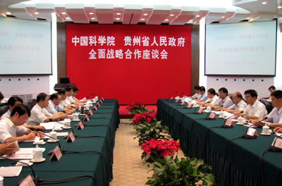中国科学院与贵州省举行全面战略合作座谈会 8月18日上午,中国科学院与贵州省人民政府全面战略合作座谈会在贵阳举行。中科院常务副院长白春礼、副院长詹文龙,贵州省省长林树森、副省长孙国强出席座谈会,座谈会由贵州省副省长孙国强主持。 会议先后听取了贵州省科技厅厅长于杰、中科院院地合作局副局长孙殿义、煤化所研究员李永旺、地理所研究员钟林生、昆明分院院长张壮鑫、国家天文台台长严俊、地化所所长刘丛强等关于院省科技合作的总体情况、院省全面战略合作规划纲要、煤炭高值转化与清洁利用、贵州旅游发展科技项目规划、FAST项目建设进展、科技支黔等相关工程和计划进展、地化所建设和发展等有关工作情况汇报。同时,会议审定并通过了《中国科学院-贵州省人民政府全面战略合作规划纲要(2009-2015年)》。 白春礼在会上发表重要讲话,他首先对贵州省省委、省政府长期以来对中科院工作,尤其是对地化所给予的关心和帮助,以及对国家重大科学工程FAST项目落地贵州建设的支持表示感谢。同时,回顾了1992年院省第一次签订科技合作协议以来院省科技合作取得的显著成绩。白春礼表示,中科院是全国人民的科学院,服务区域经济社会发展,已深深蕴涵在中科院新时期办院方针之中,为贵州经济社会又好又快发展提供科技服务是中科院义不容辞的责任。他说,坚持科学发展就是要不断深化改革开放,大力推进经济增长方式由粗放型向集约型的根本转变,积极促进城乡、区域等协调发展,调整经济结构转型,始终保持经济社会的长远后劲,实现速度、结构、质量、效益的有机统一。要实现上述目标,必须进一步加大院省合作力度,从整体上提升合作层次,充分发挥知识和科技对经济发展的重要支撑作用,将科技和知识作为转变发展方式和调整经济结构的重要驱动和中心环节。 白春礼指出,院省战略合作的总体思路,一是要结合学习实践科学发展观,响应国家西部大开发的重大决策,紧紧围绕贵州经济社会发展的实际科技需求,集中科学院优势资源,创新合作模式,拓展合作渠道,丰富合作内容,通过加快中科院科技成果的转移转化和科技攻关,为贵州经济社会全面、协调、可持续发展提供科技支持与服务;二是要整合资源,形成合力,共同着力推进和加强全面战略合作层次;三是要在对贵州产业和科技需求充分调研的基础上,紧密结合贵州产业发展的重大紧迫和关键科技需求,突出重点,务实推进,力争取得实实在在的经济和社会效益。 白春礼强调,院省合作近期的工作重点,一是要以全面战略合作规划纲要为指南扎实推进各项科技合作工作,使规划纲要确定的内容落到实处,并取得实效;二是要重点推动FAST工程建设,确保工程按计划实施,并要通过FAST工程建设带动贵州相关产业和学科发展;三是双方加强合作,将贵州省丰富的煤炭资源与我院在煤炭高值清洁转化方面较成熟的产业化技术有机结合,为贵州创造新的经济增长点;四是应充分利用我院在旅游规划方面的科学积累和实践经验,加强与贵州旅游等相关部门的沟通与合作,共同做好贵州省旅游发展的总体规划修编和专项旅游规划与示范等工作,发展科普特色旅游,做大做强旅游产业;五是要继续加大“科技支黔”工程力度,继续做好“西部之光”人才计划等专项工程与计划,不断创新合作机制,探索有效合作模式,促进中科院在贵州的科技成果转移转化、人才培养、生态环境保护和建设等工作再上一个新台阶。六是地化所的发展离不开贵州人民的养育,离不开贵州省委省政府的长期关心和支持。希望贵州省在政策许可、条件允许的情况下,一如既往地给予支持和帮助。地化所应更加主动地面向贵州经济社会发展的实际需求,发挥科技优势,切实为贵州经济社会的发展提供有力的科技支撑。 林树森在讲话中,首先对中科院长期以来对贵州经济社会发展给予的重视和支持表示感谢。并认为此次会议的成功召开,对深化院省双方全面战略合作,推动贵州省科技事业和经济社会又好又快发展具有重要促进作用。 林树森强调,贵州经济社会发展需要强有力的科技支撑。改革开放以来,贵州经济社会发展取得了长足进步。但从总体上来看贵州仍然比较落后,还需要中科院继续给予大力的支持和帮助。林树森认为,中科院是国家最高的科研和学术机构,是我国建设创新型国家的重要力量,进一步加强与中科院的全面合作,是加快贵州省经济社会发展的一项重大举措。这次会议审定通过了院省全面战略合作规划纲要,标志着中科院与贵州省的合作进入了更加密切务实的新阶段,为贵州省提高自主创新能力,推进科技创新体系建设,加快建设创新型贵州提供了难得的机遇,贵州省将按照院省全面战略合作规划纲要确定的工作目标,以及这次会议确定的合作事项,全力以赴抓好落实,确保合作项目顺利推进。 林树森还就长效合作机制建立、支持中科院加快推进FAST工程建设、大力支持地化所发展、深入实施科技支黔工程等近期重点工作,要求贵州省有关部门进一步创造条件,积极给予大力支持,共同扎实推进院省合作。 贵州省是与中科院最早开展科技合作的省区之一。1992年,中科院与贵州省政府签订了《全面科技合作协议书》。2004年又签定了新一轮的《全面科技合作协议书》。院省双方合作不断深化。特别是近10年来