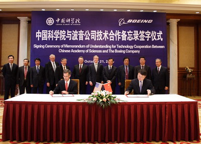 10月21日上午,中国科学院副院长江绵恒与在沪与来访的波音公司高级副总裁兼首席技术官约翰.特雷西(John Tracy)签署了中国科学院-波音公司技术合作谅解备忘录,并与波音公司代表团就促进和加强双方研发合作交换了意见。自2009年春双方签署合作会谈纪要以来,双方的管理和研发人员进行了多次交流,波音公司的研发人员也对中科院有关所进行了一系列的访问。在此过程中,双方进一步加深了相互了解和信任,明确了合作的重点领域和机制。本备忘录的签署为双方开展实质性合作奠定了坚实的基础。该备忘录将指导双方在生物能源、先进材料、无线技术等优先领域开展合作。