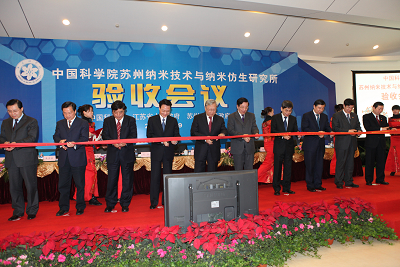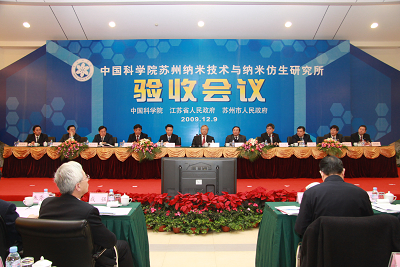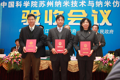 12月9日上午,中国科学院苏州纳米技术与纳米仿生研究所(以下简称苏州纳米所)在苏州顺利通过中国科学院、江苏省、苏州市筹建三方组织的验收。全国人大常委会副委员长、中国科学院院长路甬祥,江苏省人大副主任赵龙,江苏省副省长何权,江苏省政协副主席、中科院南京分院院长周健民,苏州市市长阎立,江苏省人大副秘书长、办公厅主任滕勇,江苏省政府副秘书长朱步楼,中科院副秘书长、办公厅主任邓麦村,江苏省科技厅厅长朱克江,苏州市副市长周伟强,苏州工业园区工委书记马明龙等出席验收会议,中国科学院副院长施尔畏主持会议。