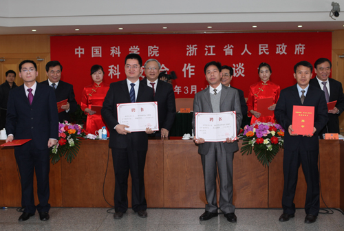 双方给中科院与浙江省互派的第二批科技特派员代表颁发聘书