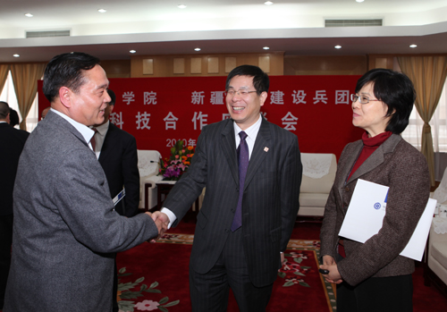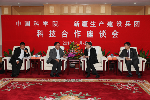3月14日,中国科学院与新疆生产建设兵团在院机关举行科技合作座谈会。中科院副院长施尔畏、秘书长邓麦村、副秘书长潘教峰,新疆生产建设兵团副司令宋建业、副秘书长刘建波,就进一步加强兵院科技合作的有关事宜进行了座谈。
