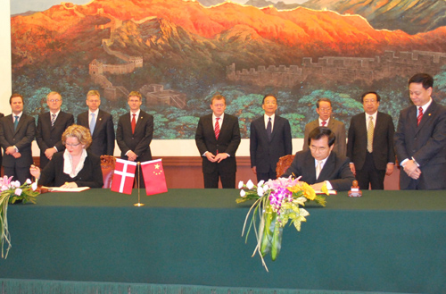 4月12日上午,在温家宝总理和丹麦首相拉尔斯·拉斯穆森的共同见证下,中国科学院常务副院长兼研究生院院长白春礼与丹麦科技创新部部长Charlotte Sahl-Madsen、丹麦高校联盟主席Jens Oddershede在人民大会堂签署了《中国科学院研究生院中国-丹麦科研教育中心合作伙伴协议》和《中国科学院研究生院雁栖湖园区中国-丹麦科研教育中心建设、维护和运行协议》。中国科学院研究生院党委书记邓勇,丹麦科技创新部及相关大学负责人出席签字仪式。