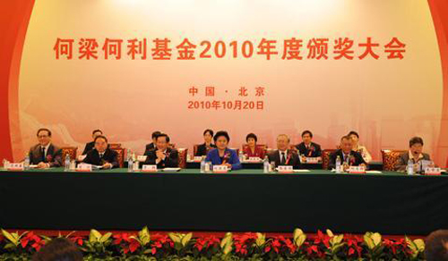 10月20日,何梁何利基金2010年度颁奖大会在北京隆重举行。中共中央政治局委员、国务委员刘延东,全国人大常委会副委员长、中国科学院院长路甬祥,全国政协副主席、科学技术部部长万钢,全国政协副主席何厚铧等出席大会并为获奖者颁奖。