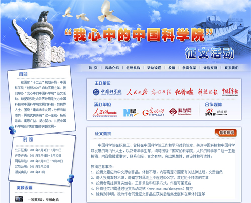 随着“我心中的中国科学院”征文活动的启动,征文活动网站(www.cas.cn/zhengwen)、活动微博(人民网微博:http://t.people.com.cn/zhengwen;新华网微博:http://t.home.news.cn/zhengwen01;新浪网微博:http://tech.sina.com.cn/cas2011/)、手机平台(15810961109)同时开通。本次活动历时约6个月,参加征文的作品将经过评委会评选、网络评选等环节,评出一等奖5名、二等奖10名、三等奖20名、优秀奖25名,并可能根据实际情况设立特别奖。获三等奖(含)以上的作品将结集出版,并在11月份举行的颁奖典礼上首发。