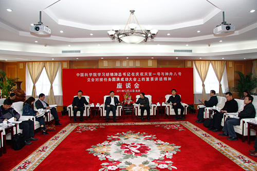 12月22日下午,中国科学院学习胡锦涛总书记在庆祝天宫一号与神舟八号交会对接任务圆满成功大会上的重要讲话精神座谈会在院机关举行。中国科学院副院长阴和俊、党组副书记方新出席座谈会并讲话。来自中科院系统11家参研参试单位的17名科研人员代表参加了座谈。