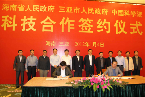 中科院副院长阴和俊与海南省副省长林方略代表双方签署了《海南省人民政府、中国科学院2012—2013年科技合作议定书》,中科院秘书长邓麦村、海南省政府秘书长徐庄、三亚市市长王勇分别代表三方签署了《中国科学院、海南省人民政府、三亚市人民政府共建中国科学院三亚深海科学与工程研究所协议书》。签约前,姜斯宪、阴和俊和王勇分别代表三方致词。