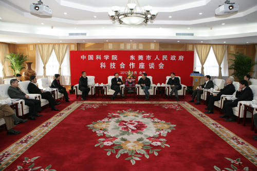 广东省东莞市市委书记徐建华在座谈时,对中科院散裂中子源和中科院云计算产业中心等项目落户东莞深表感谢。他表示,东莞市对科技促进经济发展感受甚深,目前东莞正面临全省最严峻的转型发展考验,在一个较高平台上实现高水平崛起,急需科技的支撑和引领。东莞希望借力中科院等科技资源优势,建设科技与产业融合发展示范区。