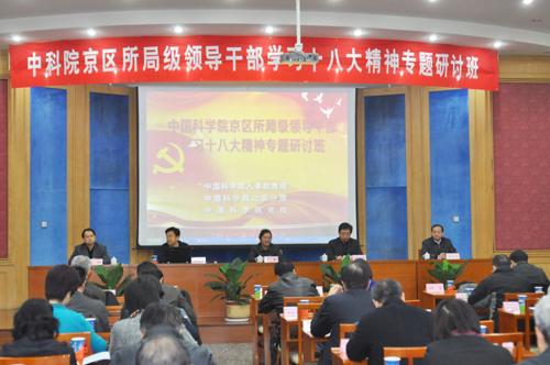12月10日,“中国科学院京区所局级领导干部学习十八大精神专题研讨班”在京举办。中国科学院党组副书记方新,院党建工作领导小组副组长、党校第一副校长王庭大,院党组成员、副秘书长、北京分院党组书记何岩出席。