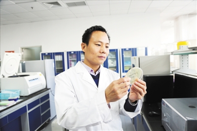 2017年12月30日,孙周通在实验室查看生物酶培养结果。受访者供图
