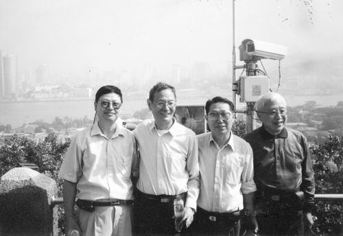 2001年薛鸣球(左二)与潘君骅(右一)在厦门参加光学测试会议。
