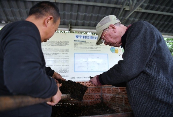 4月18日,陈庆恒(右)在指导安宁村绿色乡村营造师罗光建如何高效堆肥。新华社记者 刘坤摄