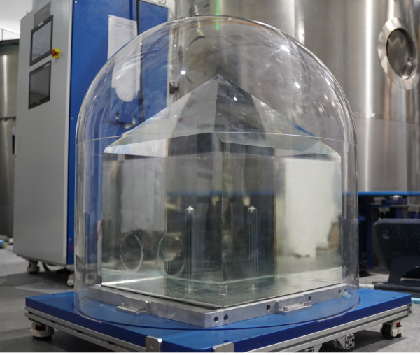 透过玻璃罩看晶体,中央长条状的是被称为“种子”的籽晶,整块大尺寸晶体就是由它生长而来的。(受访者供图)