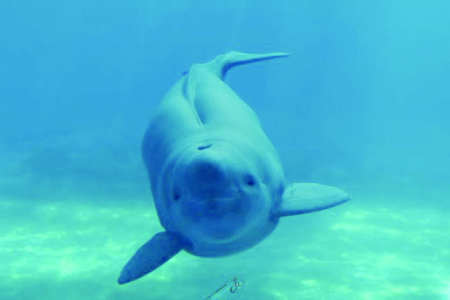 江豚和白鱀豚同属鲸目海豚科,是长江中仅有的两种哺乳动物。江豚个头儿比白鱀豚小,肤色黝黑,嘴巴弧度很长,正面看上去像在微笑。