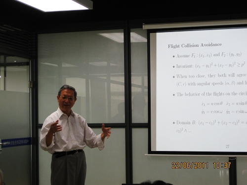周巢尘院士以中国高铁交通控制系统、飞机避撞协议为例,深入阐释了针对并行的离散与连续系统的安全性验证。与会人员与周院士进行了热烈的讨论。周巢尘院士表示,先进院可申请软件所计算机科学国家重点实验室的开放课题基金,双方可在应用于复杂系统分析、验证、优化的高性能计算等研究领域开展务实的科研合作。