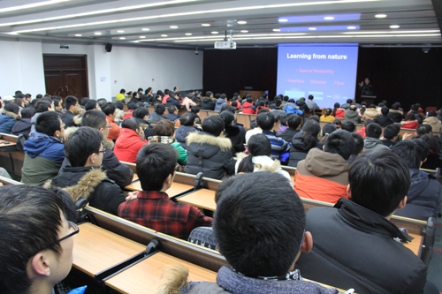 江雷以荷叶“出淤泥而不染”、仙人掌能够在沙漠中生存、蜘蛛网集水、蝴蝶翅膀表面水滴向外流淌、水黾在水面行走、鱼鳞层状叠加结构、毛笔用动物毛皮的秋毫、鳗鱼发电等自然现象和双层反电荷多孔膜海水发电的研究为例,幽默生动地介绍了其研究组通过向自然界学习,获取灵感并提炼科学问题取得的研究成果,阐述了仿生智能多尺度特殊浸润性界面材料的设计思想和制备方法,以及相关材料的应用情况。