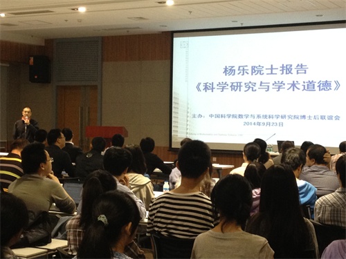 9月23日上午,由中国科学院数学与系统科学研究院博士后联谊会主办的报告会在新大楼举行,杨乐院士受邀作了题为《科学研究与学术道德》报告。数学院及周围高校100余名青年科研人员、博士后及研究生出席了报告会。报告会由数学院执行院长王跃飞主持。