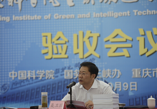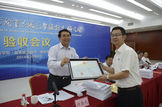 10月9日下午,中国科学院重庆绿色智能技术研究院(简称“重庆研究院”)顺利通过由中国科学院、国务院三峡办、重庆市人民政府筹建三方组成的验收委员会的验收,标志着重庆研究院经过三年多时间的筹建,正式建成。中科院院长白春礼、国务院三峡办主任聂卫国、重庆市市长黄奇帆、国务院三峡办副主任陈飞、重庆市副市长吴刚出席验收会。验收会由中科院副院长施尔畏主持。