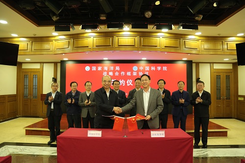 11月10日,中国科学院与国家海洋局战略合作协议签约仪式在京举行。中科院院长、党组书记白春礼和国家海洋局局长、党组书记王宏出席仪式并讲话,中科院副院长、党组成员相里斌和国家海洋局副局长、党组成员林山青代表双方签署战略合作框架协议。
