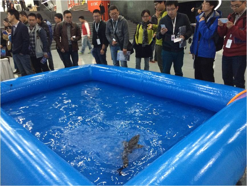 在此次活动上,中国科学院自动化研究所的仿生机器鱼和跳舞机器人项目参与了展示。在展示过程,跳舞机器人伴随着动感的“江南Style”乐曲,以团队合作的方式为大家展示了它们高超的“舞技”,引得观众赞叹不已,并纷纷拿起手机录像留影。仿生机器鱼的表演同样精彩,转弯、潜水、横滚翻,动态十足的机器鱼,用精彩的表演和逼真的形态令观众纷纷驻足,并就相关技术与演示人员进行了热烈的讨论。在活动现场,跳舞机器人和仿生机器鱼的表演吸引了活动嘉宾、新闻媒体和与会代表的极大关注。