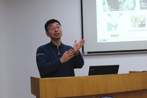 扫描电镜是观察材料显微结构的重要工具之一,特别是低电压扫描电镜应用技术在材料研究中发挥了越来越重要的作用。低电压扫描电镜是近年来场发射电镜的发展趋势,它使得人们能在接近电荷平衡的电压下直接对不导电样品进行分析和观察,有效地避免了材料的荷电问题,同时也避免了由于镀膜导致的细节掩盖现象。曾毅结合扫描电镜在材料研究中的一些重要应用实例,介绍了如何选择合适的电镜工作条件,用低电压扫描电镜技术获得材料表面或断面晶粒大小、形貌、分布等信息,以及怎样获得材料的晶体学信息。报告激发了固体所科研人员的强烈兴趣,会场内座无虚席。