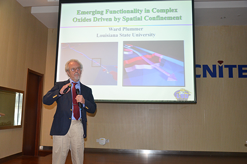 6月2日,中国科学院宁波材料技术与工程研究所“科技大讲堂”又迎来一位国际知名科学家——美国科学院院士、著名物理学家、路易斯安那州立大学教授Ward Plummer,他带来了题为Emerging Functionality in Complex Oxides Driven by Spatial Confinemen的精彩学术报告。副所长李润伟主持报告会,所长崔平出席报告会,并为Ward Plummer赠送了“科技大讲堂”纪念牌。