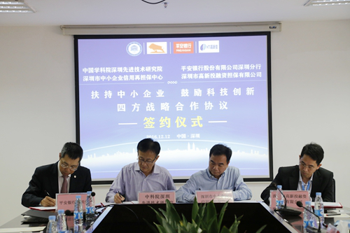 12月12日下午, 中国科学院深圳先进技术研究院、深圳市中小企业再担保中心、平安银行深圳分行、深圳市高新投融资担保有限公司在深圳先进院举行合作签约仪式。