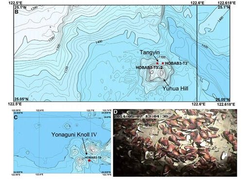 首次在冲绳海槽南部的唐印热液区发现有流体活动的黑烟囱体群和热液溢流喷口,证实该区蕴藏丰富的多金属硫化物资源;在第四与那国热液区,发现硫磺喷口和出露于沉积物覆盖区的新热液喷口;同时,在八重山地堑附近采集到具黑色枕状构造的玄武质熔岩。以上发现为评价冲绳海槽多金属硫化物资源潜力、揭示冲绳海槽地质演化过程和维护国家海洋权益奠定了重要工作基础。首次对冲绳海槽唐印热液区的贻贝(Bathymodiolusplatifrons)与蛤(Conchocelebisecta)以及龟山岛热液区的螺(Anachissp.)进行了化学组成研究,揭示了生物壳体及不同组织中元素富集、分配与热液流体之间的关系,明确了生物壳体化学组成对热液活动的响应,为深入认识热液区生物记录的热液活动信息提供了研究支撑。