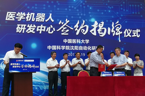 7月19日,中国科学院沈阳自动化研究所、中国医科大学在沈阳举行签约揭牌仪式,双方合作共建医学机器人研发中心。会上,中国医科大学副校长于晓松、沈阳自动化所副所长李硕签订了全面战略合作协议。