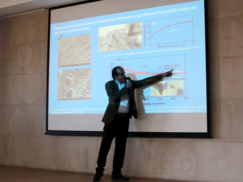 报告中,Tata Narasinga Rao以印度为例,介绍了其与发达国家在纳米材料领域中存在着竞争,有很多巨大的挑战需要被克服的现状。同时,Tata Narasinga Rao着重介绍了纳米技术在健康和能源相关技术中扮演的非常重要的角色,包括抗菌、能源储存、能源转换、绝热等。最后,Tata Narasinga Rao简要介绍了印度粉末冶金与新材料国际研究中心正在研究的基于生物质碳的电池汽车,认为锂离子电池以及超级电容器对于能源储存将在未来有很好的应用前景。报告结束后,Tata Narasinga Rao还与科研人员及研究生就共同感兴趣的科研问题进行了热烈的讨论。