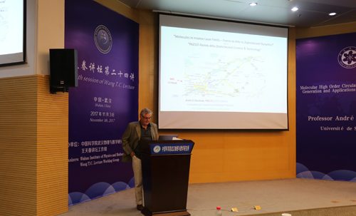 2017年11月3日,中国科学院武汉物理与数学研究所“王天眷讲坛”第二十四讲在频标楼一楼会议室举行,André D. Bandrauk教授作为本次报告主讲嘉宾,做了题为《Molecular High Order Circularly Polarized Harmonics –Generation and Applications in Attosecond Science》的精彩报告。武汉物数所柳晓军副所长主持此次讲坛由,并向André D. Bandrauk教授颁发了“王天眷讲坛讲席教授”的聘书和铭牌。