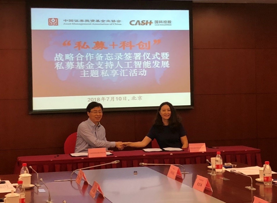 7月10日,中国科学院控股有限公司(简称“国科控股”)与中国证券投资基金业协会(简称“中基协”)在北京举办了“私募+科创”战略合作备忘录签署仪式暨私募基金支持人工智能发展主题私享汇活动。中科院系统40家科技型初创企业代表和中基协40家私募机构会员代表参加活动,本次活动由北京国科金服科技金融信息服务有限公司承办。