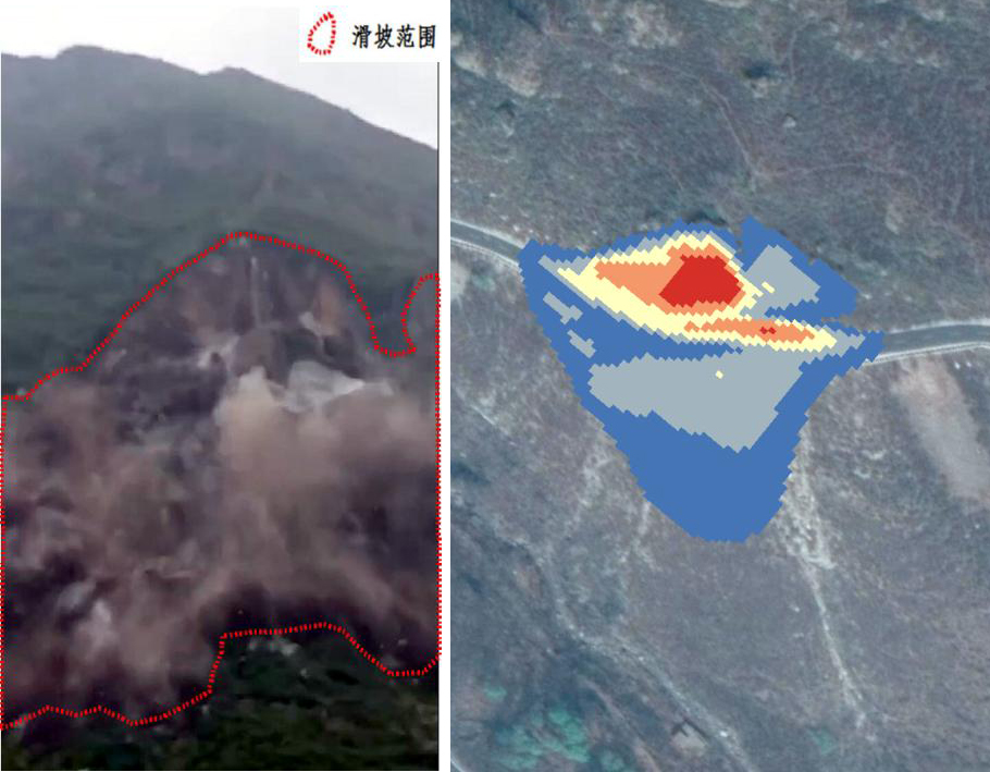 DeepLab提取的滑坡演化过程(左)和Massflow滑坡过程数值模拟及参数校核(右)