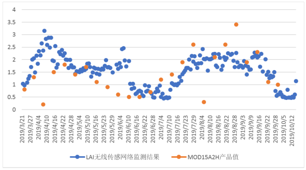 图4 LAI无线传感网络监测结果与MOD15A2H产品对比图(以千烟洲站为例)