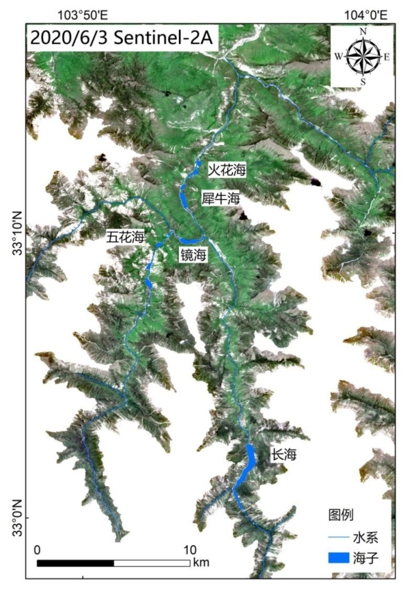 通过6月3日遥感影像对水体的解译显示,遗产地的水体面积约为220.79公顷。其中,树正沟(沟口至诺日朗瀑布)全长约13.8km,海拔约2500-2600m,主沟段由北向南依次为火花海、双龙海、树正群海、犀牛海;日则沟全长约25.3km,海拔约2600-3100m,由北向南有镜海、珍珠滩、金铃海、五花海、熊猫海、箭竹海;查洼沟长约31.7km,海拔约2600-3100m,从北向南有下季节海、上季节海、五彩池、长海。九寨沟地震发生后,诱发了大量同震滑坡,主要分布在日则沟,其中五花海的水体变得异常混浊。经过三年恢复重建,海拔2472m的五花海形似一只开屏的孔雀,其长520m,最大宽度260m,面积8.47 公顷,在藻类和钙华等多种因素共同作用下,湖水色彩丰富。五花海湖水较浅,其底部藻类中的叶绿素对太阳光的反射和红光散射作用比较强烈,显示出五彩斑斓的色彩。团队通过高精度无人机数字正射影像进行九寨沟核心遗产点水体面积精细提取,解译得到经过三年的恢复重建,其他海子水体面积也逐渐扩大,其中,熊猫海面积8.45 公顷、箭竹海面积15.32公顷、镜海面积17.73公顷、诺日朗群海面积2.38公顷、犀牛海面积21.86公顷。