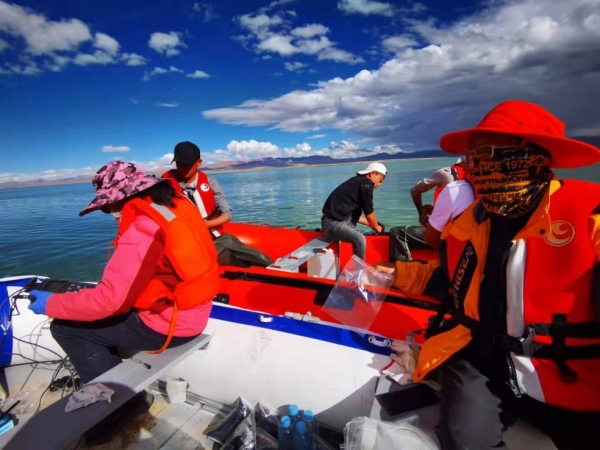 在依布茶卡盐湖进行水体和沉积物样品采集