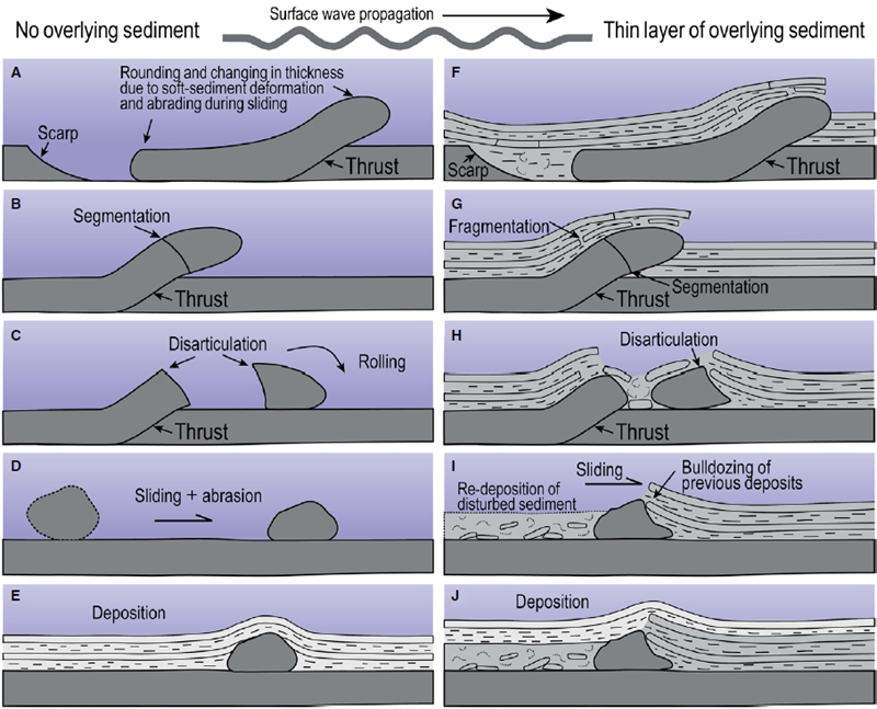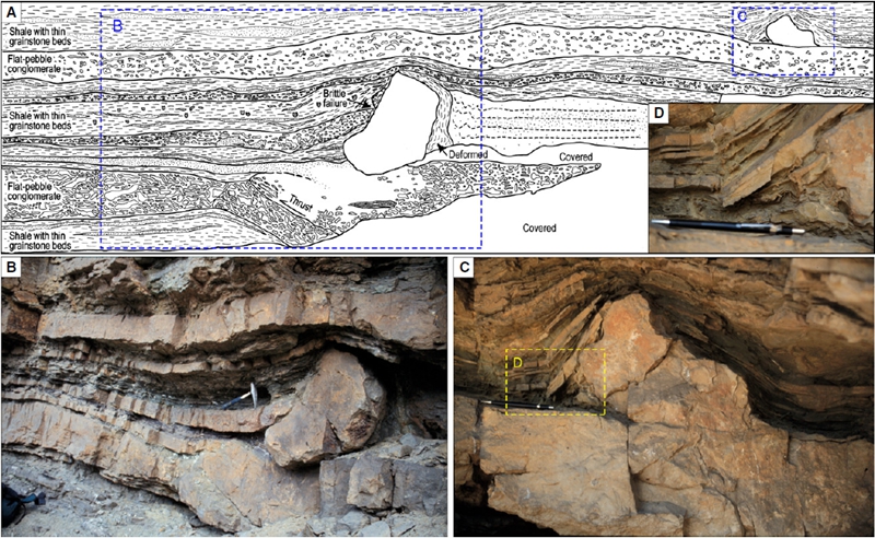 此外,陈吉涛还受邀作为论文共同通讯作者合作研究了美国科罗拉多州西部洛矶山脉寒武系发育的独特的软沉积变形构造(图2、3),这些岩块大小为几厘米至一米多不等,通过详细研究发现,这些不规则岩块与小型同生逆冲断层及滑坡壁密切共生,从而提出它们是同生滑塌与逆冲断层的伴生物,认为这些软沉积物变形构造是由地震引发的(图4)。根据这些不规则岩块的形态、尺寸及其共生的逆冲断层倾角等参数,估算了古地震级别为>6.3级,这是目前发现的前第四纪洛矶山脉唯一一次由沉积地层记录的古地震事件。