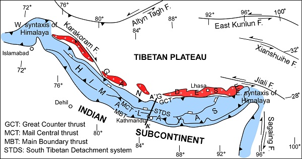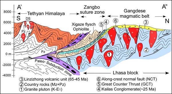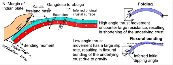 中国科学院地质与地球物理研究所研究员王二七及其合作者通过多年野外地质填图、构造解析、沉积盆地分析,结合氩/氩、裂变径迹、锆石铀-铅和古生物等定年技术,发现冈底斯山脉并不是一个向南逆冲的大型推覆体,其隆升实际上是受大喜马拉雅反冲断裂导致印度大陆岩石圈仰冲作用的控制(图2、3),即:印度大陆岩石圈仰冲产生的重力载荷导致冈底斯山脉的南部发生挠曲沉降,从而产生了一个前陆盆地体系。冈底斯山脉的主体实际上是该前陆盆地体系的前隆单元。该项研究首次揭示冈底斯山脉的抬升与向南推覆作用无关,而是岩石圈挠曲隆升的结果;进一步揭示雅鲁藏布江杂岩带是一个向北位移了约70公里的无根推覆体。该项研究还提出,印度大陆岩石圈的仰冲受控于喜马拉雅山的挤压隆升,指示喜马拉雅山经历了两个阶段构造过程:早期(26-23百万年)造山过程表现为喜马拉雅山向南和向北同时推覆,分别形成了喜马拉雅前陆盆地和大竹卡(或称Kailas)前陆盆地(图4A);晚期(22-20百万年)造山过程主体表现为向南大规模逆冲推覆(图4B)。