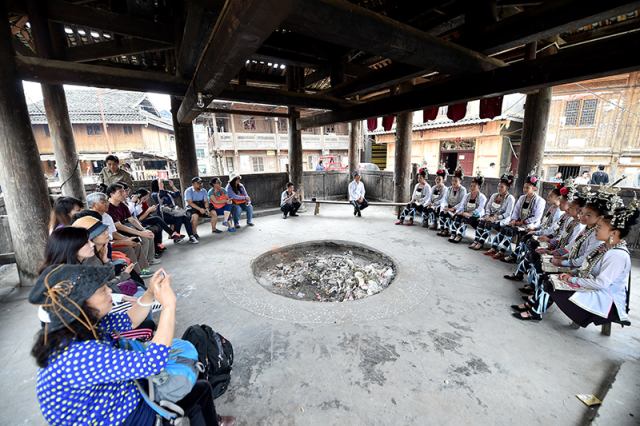游客在被誉为“侗族大歌之乡”的从江县小黄村观看侗族大歌表演,侗族大歌于2009年被列为“世界非物质文化遗产”(9月21日摄)。