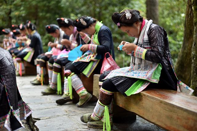 从江县芭沙村妇女在刺绣(9月20日摄)。芭沙苗寨被誉为苗族传统文化的“活化石”和“博物馆”。