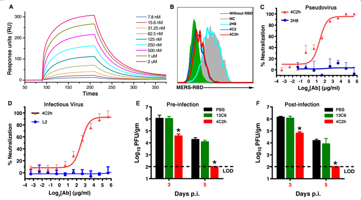 图:人源化抗体(4C2h)的生化特性和中和活性。(A)利用生物分子相互作用技术分析抗体结合抗原的亲和力;(B)通过流式技术验证抗体能够阻断抗原与受体结合;(C,D)在细胞水平证明抗体可以中和(C)假病毒和(D)活病毒,阻止其感染细胞;(E,F)在小鼠模型中,抗体在病毒感染前(E)或感染后(F)使用均能有效清除病毒。