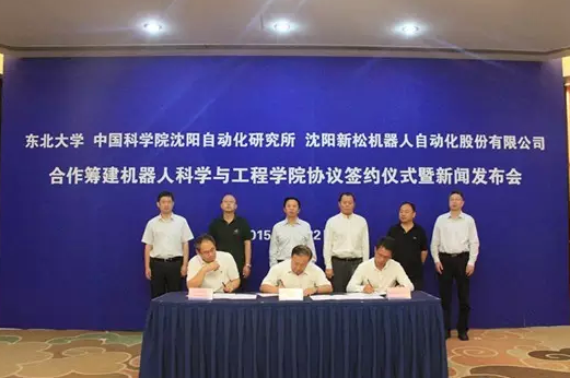 9月22日,东北大学、中国科学院沈阳自动化研究所、沈阳新松机器人自动化股份有限公司合作组建机器人科学与工程学院签约仪式在东北大学举行。东北大学校长赵继、沈阳自动化所副所长史泽林、新松公司总裁曲道奎分别代表三份讲话并在合作协议上签字,市委常委、常务副市长顾春明出席签约仪式并讲话。