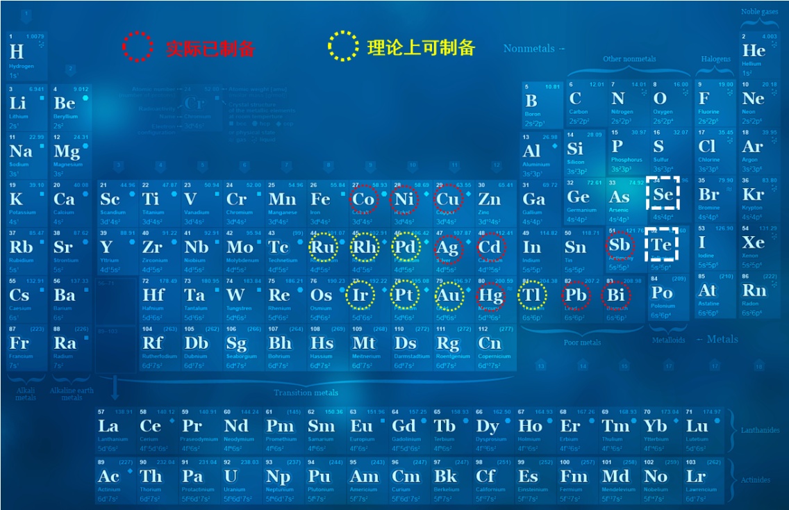 图1. 图中红圈标记的元素表示已实际制备出相应金属-硒-碲合金纳米线的金属元素,黄圈标记的则为理论上可制备相应金属-硒-碲合金纳米线的金属元素。