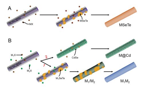 图2. (A) 单金属硒碲合金纳米线的形成;(B) 多元金属-硒碲合金纳米线及杂化结构纳米线的形成。