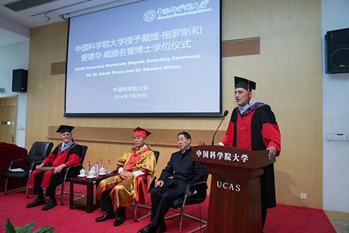 7月29日上午,在中国科学院大学(简称“国科大”)中关村校区教学楼,诺贝尔奖获得者、中国科学院外籍院士戴维•格罗斯(David J. Gross)和菲尔兹奖获得者爱德华•威滕(Edward Witten)双双接受国科大授予其名誉博士学位,并发表公众演讲。