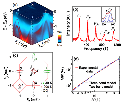 (a)ARPES测量的LaSb电子结构。(b)量子振荡实验数据。(c)ARPES和量子振荡数据解析出的二维费米面,经过对称化可进一步构建出三维费米面,解出载流子的浓度。(d)两带和三带模型对磁阻数据的拟合。