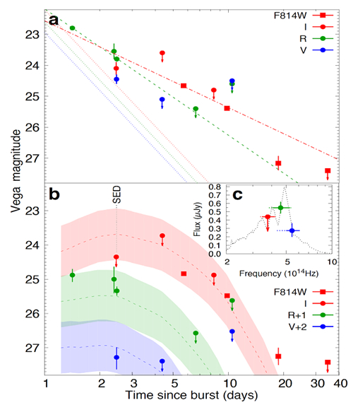 随后该团队把GRB 050709作为突破口。GRB 050709是人类首次探测到光学对应体的短暴,该光学信号一直被解释为伽玛暴的喷流在星际空间运动产生的余辉辐射。紫金山天文台金志平等人对甚大望远镜VLT、HST数据的系统分析颠覆了这一结论。他们发现VLT在伽玛暴结束后2.5天处测得的能谱与余辉模型显著不同,而与巨新星信号一致,可以被将来的观测进一步检验,一旦得到验证,将是中子星并合过程合成重元素的观测证据。他们的分析表明,GRB 050709的光学辐射自2.5天起就由巨新星成分主导,并且该暴很可能由一个中子星与黑洞的双星系统的并合产生 (见图2)。从GRB050709和GRB060614中得到的巨新星光变曲线非常一致,可以作为搜寻引力波事件对应体巨新星的输入模板,指导引力波电磁对应体的搜寻、观测工作。金志平等人还首次对巨新星与短暴/长短暴的关联性进行了统计分析,发现每个短暴/长短暴很可能都伴随着一个巨新星。这表明巨新星普遍存在,是引力波事件的极佳电磁辐射对应体。