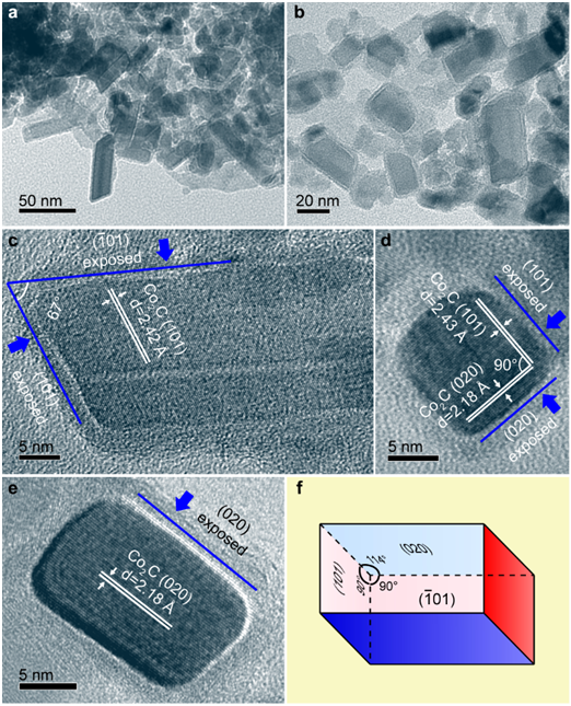图1 FTO催化剂TEM照片。a、b为低倍数TEM照片;c、d、e为高倍数TEM照片;f为Co2C平行六面体纳米颗粒示意图。